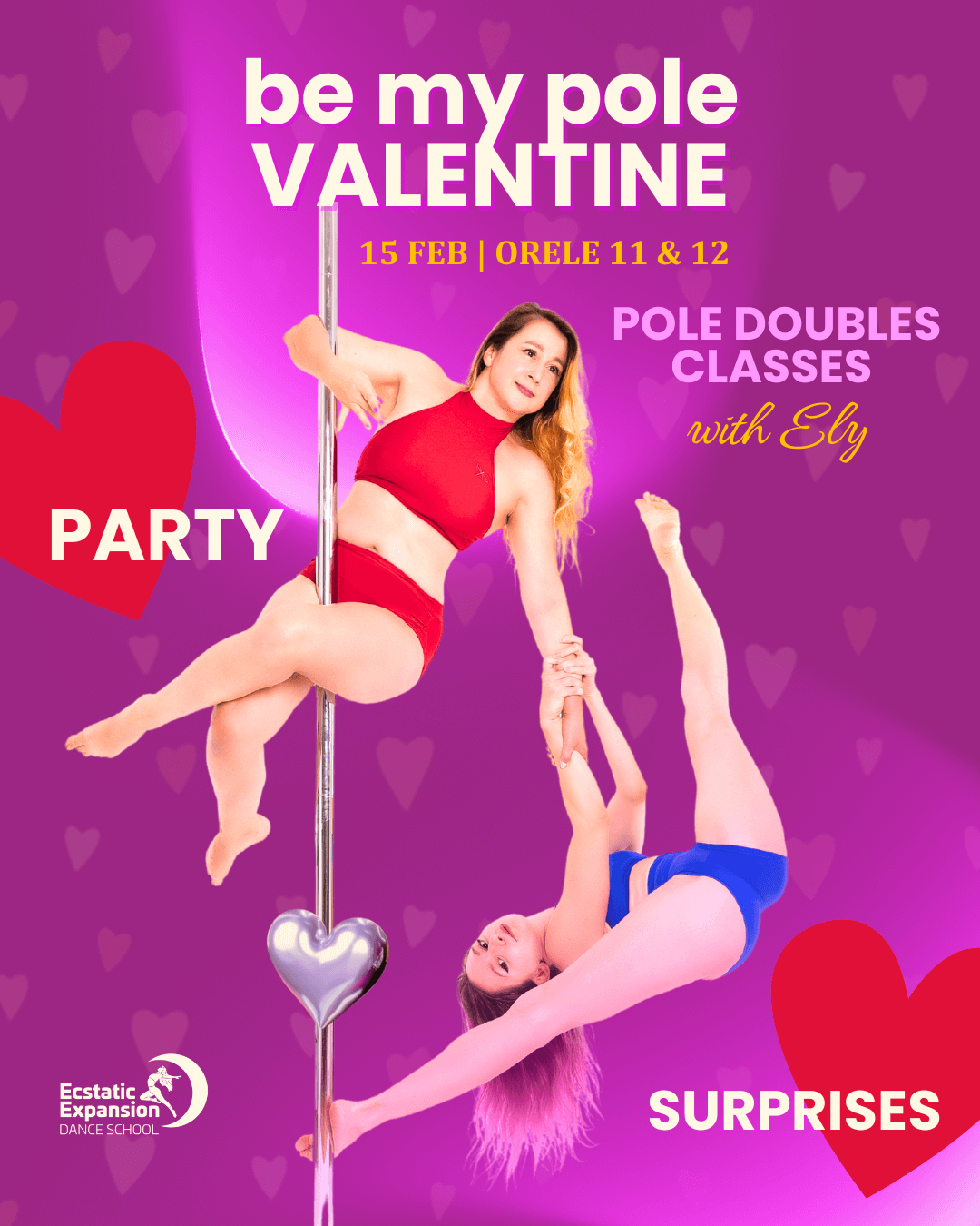 Pe 15 februarie, la cursurile de Pole Art cu ELY, de la orele 11 și 12 sărbătorim dragostea noastră pentru această formă de artă atât de frumoasă, cu elemente de Pole Doubles și atmosferă de Party.